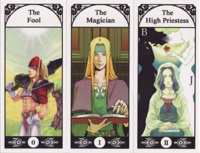 19 October 2009 A few years ago I managed to buy a copy of the Escaflowne Tarot issued in 1997 with the Playstation game based in turn on the manga and popular anime series. I knew that there was another Escaflowne Tarot issued in the form of trading cards with Escaflowne videos. These proved more elusive, and I missed out on one a year or so ago when I was outbid on an auction. There are obviously many Escaflowne fans who want to collect these cards. However, last week I managed to buy a full set of these cards. There are 22 cards and strangely four of these are in landscape format. Each of the cards relates both to a tarot arcana and a character from the anime.