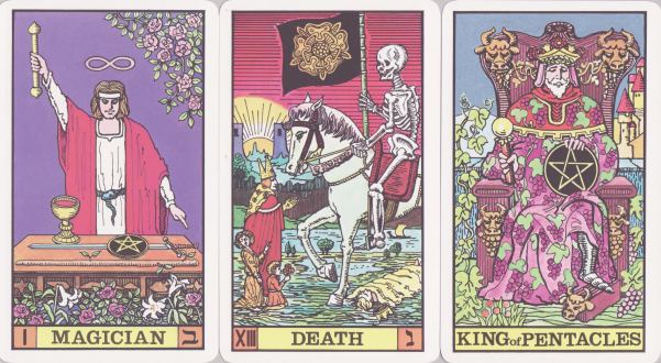 26 November 2009 Kazuki Takahashi is a manga artist, illustrator and game creator who created the manga Yu-Gi-Oh! This later appeared as an anime and a number of spin offs including video games. I have obtained a small tarot deck using his artwork, published by the Shueisha Publishing Co, one of the major publishers of magazines in Japan. The original manga images are presented on a background layer of a line drawing of a wall panel from an Egyptian tomb, thus perpetuating the idea that tarot was somehow connected to ancient Egypt, a common preconception in the 19th and early 20th centuries.