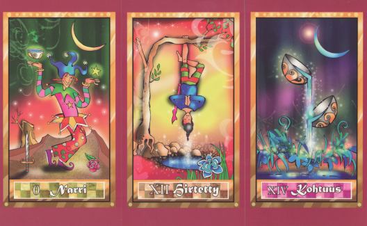 7 September 2009 A week or so ago I discovered a tarot from Finland which I had not previously known of. This is the Tarot Kortit of Anita Polkutie, published by Positiivarit. I bought a copy which arrived this morning. It is a 78 card deck with conventional pip and Court cards without any significant emblematic symbolism. The images in the Majors are a delight. The artwork is deliciously coloured with very neat and clean lines. The Fool is quite delightful. This deck was published in 2006 but neither myself nor many of my fellow collectors had heard of it. It makes me wonder how many other wonderful decks have been published which I have missed.