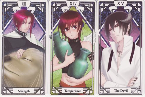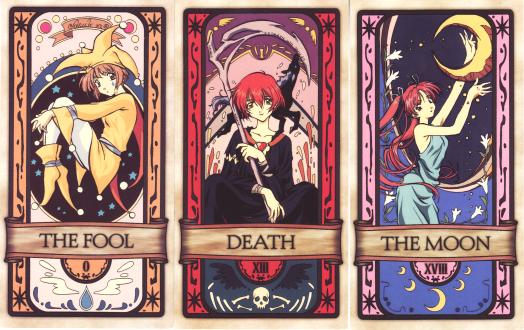 14 August 2009 I have just bought the two Tsundere decks recently issued by the Japanese manga company Dears. "Tsundere" is a Japanese word with perhaps no immediate English equivalent. It has come to describe one of the character types found in manga and anime, being usually applied to a female character who is "in your face" outrageous, displaying much histrionics with a high squeaky voice, and yet with a soft gentle femininity hidden underneath which only appears when needed in the plot. Dears have decided to issue two Tsundere decks - the first has female characters, while the second has male ones. These each come with a CD-Rom which purports to explain the tarot. I suppose we should really see these as promotional items. Unlike many Japanese tarot these are receiving wide distribution and are easily available. ![]()