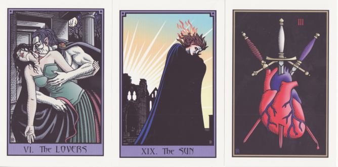 11 September 2009 Robert Place's Vampire Tarot has been in preparation for some time but at last it is available from St Martin's Press in New York. It comes in a well made box with a tight fitting lid, that took me some time and shaking to get to the contents. Inside is a set of 78 large cards and a substantial paperback book of 227 pages. The artwork is in Place's familiar clean style, with boldly outlined figures and subtle colour shading and modelling. Robert Place, I suspect, sees tarot as a medium for art, rather than primarily as a divination system, thus his cards are large and perhaps too wide for many people to hand shuffle and also the corners are not rounded. The imagery is wonderfully suited to the theme, with some humourous incidents and many references to various aspects of vampire mythology. His book is is very helpful and leads us through many of the influences which led him to represent each tarot card in the way he did. He is very influenced by the Jungian approach, which is often applied to tarot and other symbolism systems. He does not present us with a dark and intense vampire tarot, gothic and grim, but rather a cerebral and aesthetic one.