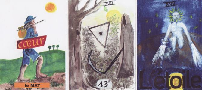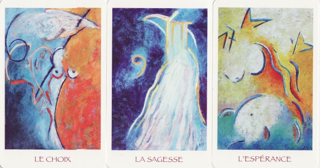 5 May 2010 Le Tarot Essentiel issued by Arcadia Editions in Paris this year. It uses paintings of Andrea Wedell and has a book written by Francoise Bitton. The 22 cards are for the most part renamed, but reflect the established arcana. Thus the Lovers is here, Le Choix (Choice), The Hermit is La Sagesse (Wisdom) and so on. All is explained in the book. Wedell's artwork is abstract and in the style of Paul Klee, colourful background textures with angular and circular forms set on it. Like Paul Klee's paintings, this is not entirely abstract but still contains sufficient pointers and references to figurative forms, that one can easily recognise the arcana.
