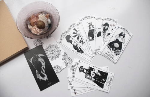 23 September 2009 I recently received a rather fine self published tarot by an Chinese artist. This is the Asaph.z Tarot, and sadly I cannot find out very much about this artist. They have a weblog at http://blog.sina.com.cn/asaphmxy but as I don't read Chinese I cannot get any details. However, the black and white tarot, in the elongated style often adopted by Chinese tarot artists from the traditional format of Chinese playing cards, is delightful.