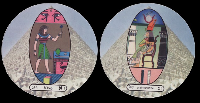 13 June 2009 I also received another circular tarot in the last few days, this time from Argentina. This is the Tarot Egipcio Circular from a company called A.G. These are large 4.25 inches (110mm) diameter circular cards. Each of the 78 cards is printed with the face of one of the Gizeh Pyramids with the central space being occupied with a kind of cartouche form, more oval in shape than the usual Egyptian cartouche. This is divided into three zones, the central having a drawing in the style of the incised figures from the walls of Egyptian tombs, with some influences from the Wegener-Falconnier Egyptian tarot. These are, in fact, a repainted version of the Egipcios deck issued some twenty of so years ago by Editorial Kier in Argentina and U.S. Games.