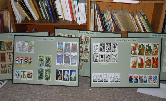 4 March 2009 I have made some progress on creating the exhibits for the forthcoming exhibition. I am using large frames (50 by 70 cms) in which I can show examples of cards from decks on related themes. There will be about 30 of these together with a number of glass cases, within which tarots in books and layouts of full decks can be placed. Setting these up is exacting work and will take probably up much of March as I always have so many things to do, binding books, sending out packets, trying to squeeze in some painting time, researching alchemical works, studying emblems and paintings and of course looking for new tarots to collect.