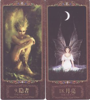 That part of my shelf space devoted to Chinese and Taiwanese tarots is crammed with lots of those big-box tarots. Anyone who buys these decks will know what I mean. A big strong solid box with a magnetic fastening flap, inside lined with a satin like material, containing a small paperback book and the deck of tarot. This one is entitled The Fantasy treasure tarot box and is a 78 card deck, with the familiar elongated format that the Chinese seem to prefer, based, no doubt, on their playing card tradition. This present tarot, like a number of others I have, presents fantasy artworks on tarot cards. It is a compilation from different artists. These artists do not seem to be credited. The pips do not have any emblematic artwork. The choice of images for the Majors is quite apt.