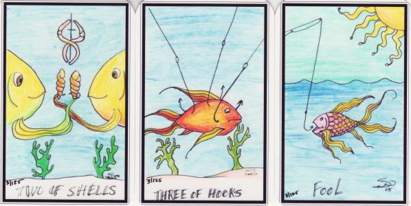 20 May 2009 Beth Seilonen never ceases to amaze us with her creative invention. I try to keep up with her output. She never tires of exploring new ways to work with tarot imagery. Recently I bought her Fishy Tarot, which is a 78 card, fully emblematic deck. Here the suits are Hooks, Masts, Pearls and Shells. As always, Beth brings her subtle and gentle humour to her designs. This one I will place in the Beth Seilonen drawer of my tarot collection, alongside her Isabel Snail, Frog and Sun Conure Tarots. Every tarot collector should try and buy some of her decks. They are usually limited to a small number. I have just bought two of her new issues, and will present them on this weblog over the next few weeks.