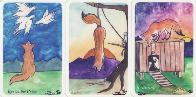 11 March 2010 On first glance the Foxy Arcana might appear not to be a tarot deck but an oracle. The familiar names of the arcana are missing, but when we look at the imagery and titles such as 'Enchanter', 'Guardian of Shadows', 'Termination', 'Fate', we realise that Beth Seilonen's sense of humour has deceived us again. The Foxy Arcana presents us with little tableau of the fox and the chickens in which inevitably the chickens appear to win, except in arcana 15 'Devour' or the Devil who lies on his back having consumed a considerable number of chicken victims, and 21 'Living' or the World, where our fox savours the aroma of roast chicken. This is a small limited edition of only 20 copies in Beth Seilonen's inimitable style.