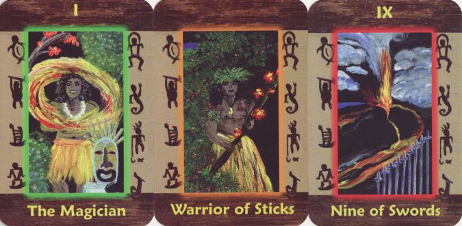 9 June 2010 HazelMoon's Hawaiian Tarot arrived today. This 78 card deck is localised to the ancient culture and landscape of Hawaii through the paintings of Katalin E. Csikos. It comes in a big box with a booklet is easily available though various tarot outlets and also direct from the artist www.myhawaiiantarot.com