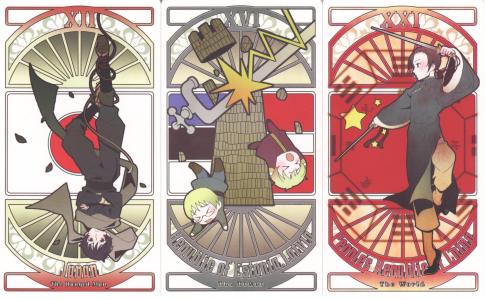 16 March 2010 Following on from yesterday's entry I have another fan art deck, this time for the Manga Axis Powers Hetalia. This is a deck and fanbook produced by Ryoko and Shinia. The cards are printed onto a metal coated card, which as you will see below has not scanned well. The margins should be a shiny gold colour, but the scanner light is scattered and shows up as green. I do like the Tower as a pile of television sets. I included the earlier Axis Powers Hetalia deck by Koze in my exhibition on the Art of Japanese Tarot, so I will show it below for comparison.
