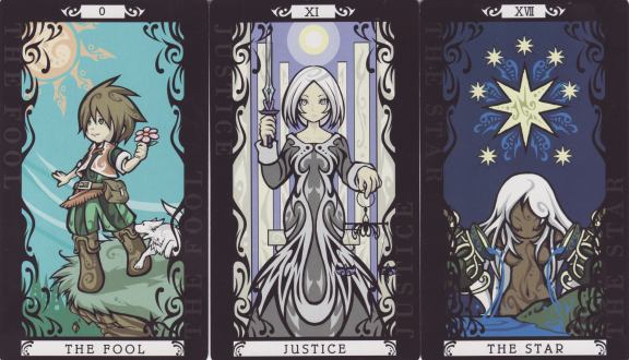 29 September 2009 The rather strangely named E's Tarot from Japan arrived recently. The artwork is by Satol Yuiga one of the Square Enix stable of illustrators and is dated to 2005. This is a majors only deck and each have been renamed but retain their usual titles in the card design. Thus the Fool is the 'Nameless-One', Emperor is 'Actor', the Wheel of Fortune is the 'Royal Maze', Moon is 'Reacter' and so on.