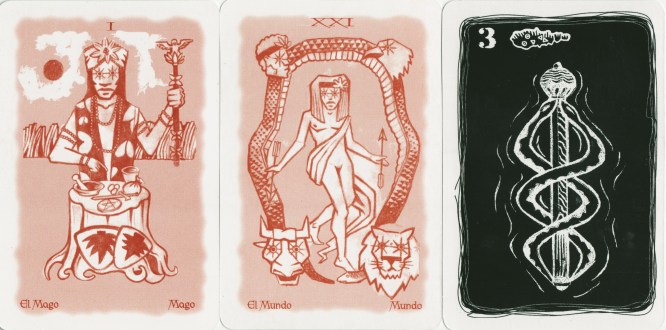 21 January 2009 The countries of South America have produced a number of interesting tarots, though these are difficult to source and obtain. Today I have in my hands the Oraculo de los Orichas by Nancy Silvia Mascialino, apparently self-published in 2007 in Argentina. Despite its title, this is a genuine tarot, with the Majors printed in a terracotta colour with the Minors in black ink. Each minor has a drawing in white on a black background, which looks like scraperboard, but could well have been done in some medium imitating this. The imagery of the Majors is quite original, though influenced by the indigenous art of the Pre-Columbian period.