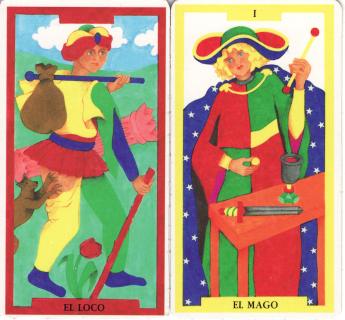 31 December 2008 I sometimes wonder if I am not the most obsessive of tarot collectors. Sometimes I get rather engaged by a particular deck and try hard to find a copy. Often these are not especially collectable, nor of great artistic merit and seem to have little perceptible value. One of these I have been looking for over the last few years is a deck issued free with the Spanish magazine Superpop. Now there is a well known Superpop tarot and it is relatively easy to find, but Superpop issued another deck El Gran Juego del Amor ('The Great Game of Love') which proved quite elusive. I finally managed to buy a copy from someone in Spain and it arrived today. It is one of those press-out tarots, printed on thickish card bound into the magazine - even the box is a press-out. It is surprising how decks like this, given away free in magazines, are so very difficult to find. I have many such from Japanese magazines, where they are called Furoku (gifts). Although at the moment these have little perceived value, as collectors tend to assign high prices to better known rare decks, such as the Greenwood, but I expect, in the years to come, as people expand their collecting vision, decks such as this from Superpop will acquire a more realistic value. The artwork, in watercolour, is bright, using large areas of colour.