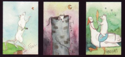 22 June 2010 My rather sombre mood of the last few days, which were overshadowed by my having to give up publishing tarots, was lightened today by the arrival of a single sheet of paper, a mere 11 by 8.5 inches. On this was printed the TaRat, a miniature deck designed by Nakisha. There are 78 small thumbnail sized cards printed onto this sheet of this beautiful and amusing rat themed tarot. Nakisha has previously created the Rabbit Tarot and like this the TaRat is based on her strong character drawing which she has coloured. You can find her artwork on sale through her store on Etsy or her web site www.nakisha.com/the_taRat.htm. Everyone should buy a copy of this. It is not expensive. Do buy a copy, frame it up and put it on your wall. Stand back and enjoy.