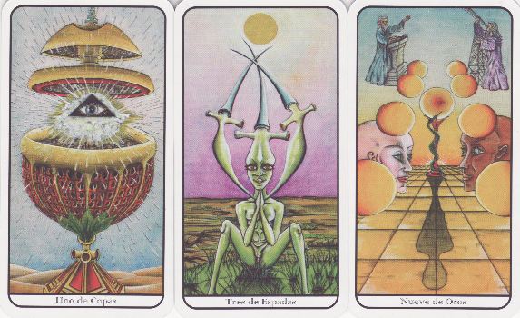 16 November 2009 Today a rather original tarot arrived from Spain. The artwork is by Juan Albiol. I first came across these tarot designs in December 2006 when Juan Albiol was trying to publish his images, but the project then failed to work out. So it was good to see that he had finally managed to have these printed. It is called the Tarot Trascendental and the atwork is truly delightful. The majors are relatively conventional though we are led into a strange world of alien like beings, but the Minor arcana are a riot of originality. Strange organic forms entwine around alien like beings. We are far away from Pamela Colman Smith, probably on a different planet. The detail in the paintings is amazing. This is tarot art in its essential form. No collection of tarot should be without this deck.