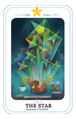 28 November 2009 I also recently bought a copy of an early 1990's Japanese tarot. This is the set of tarot cards illustrated by Emiko Sugi and published in 1993. The cards show the tell tale signs of having been pressed out of a printed sheet, which makes me think that they were originally issued in a magazine as press outs. Emiko Sugi was a manga artist specialising in the young teenage group. Sadly she died a few years ago at the young age of only 47. Her art style relied on the strength of her fine line drawings. Kaplan's Encylclopedia of Tarot Vol IV has illlustrations of these designs on page 658 where the tarot is named Rise no Miracle Tarot and reported as being issued by Shojo Comic in 1999. This may be a later reprint. My copy bears the date 1993.