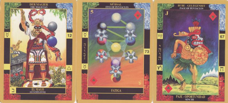 8 April 2010 Today a rather exciting tarot arrived, the Tarot Andino by Ernesto Montes Aliaga. This was published in Lima, Peru by Editorial Inti Yalamuy. I am not entirely certain of the date, but it appears to have been issued in 2000. It is a 78 card deck and is subtitled 'Le Kabbala Andino Revelada' the Kaballah of the Andes revealed. It is obviously structured around kabbalistic ideas and an esoteric view of Peruvian mythology. I paid a relatively high price for this item, but as it is so rare and obscure, I was happy to have been able to buy a copy. It will be one of the gems of my South American collection along with the Tarot Thayer, Tarot das Bruxas, Tarot Infinito, Tarot Bellavista, Tarot de Autolectura.... Heh there are too many to list !