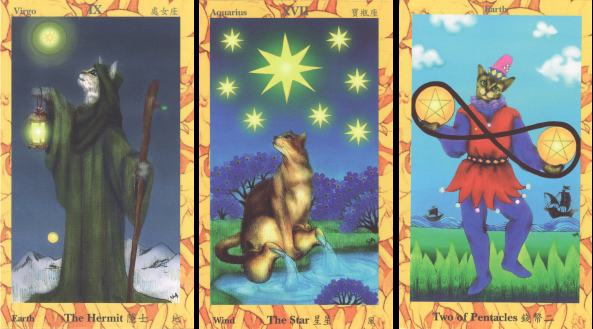 20 January 2009 There must surely always room in ones collection for another cat tarot. I must have about 20 or more - one day I must count them. In the last few days I have acquired two more. One is a Cat Tarot from Taiwan, created by Tia, accompanying a book by Alice Chen. This is a 78 card deck which comes as a series of press-out printed cards packaged with the book. It is a Rider Waite clone, nicely drawn and painted. For the most part the cats are anthropomorphised, but with a few in their natural form.