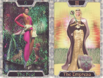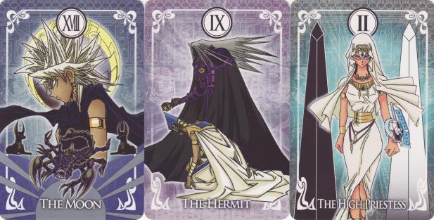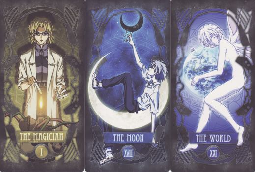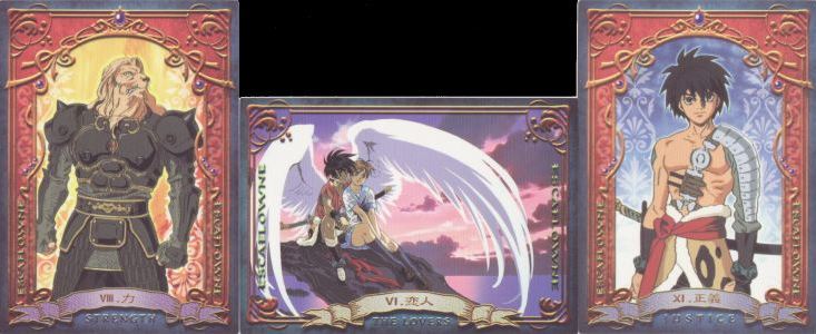 19 October 2009 A few years ago I managed to buy a copy of the Escaflowne Tarot issued in 1997 with the Playstation game based in turn on the manga and popular anime series. I knew that there was another Escaflowne Tarot issued in the form of trading cards with Escaflowne videos. These proved more elusive, and I missed out on one a year or so ago when I was outbid on an auction. There are obviously many Escaflowne fans who want to collect these cards. However, last week I managed to buy a full set of these cards. There are 22 cards and strangely four of these are in landscape format. Each of the cards relates both to a tarot arcana and a character from the anime.