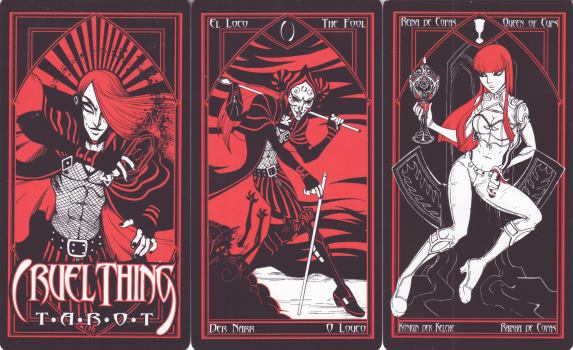 27 July 2009 Over the weekend I bought three more storage units, as my collection had degenerated into items piled upon one another, and it was becoming almost impossible to find things quickly. The main problem was the american tarots. There are so many of these, that I really need to have a drawer for each letter of the alphabet. Today I began assembling the storage units and hopefully, by the end of the week, things will be much more organised. This will also free up my map chest, which I need to store the ever growing quantity of artwork and prints I produce, as well as a great deal of research material for my paintings. I am not just a tarot enthusiast but also produce books, prints and paintings, so space and storage is always a problem. See this page for my prints, and this page for my recent paintings on the theme of the Temptation of St Anthony. 21 July 2009 I have decided that I will no longer publish tarots by people who have a full deck in mind but only those who think in terms of a Majors only deck. I have had problems with the Tarot of the Sidhe and the Quantum Tarot, where the pre-announcement of a full deck just killed sales of my Majors only edition. In both these cases I knew from the outset that the artists were thinking in terms of a full deck, but I made the judgement that there was room for both a limited edition Majors as well as the full 78 card deck. This assessment of mine appears to be flawed. It is, I now see, also unfair to the artist to publish only their Majors as they may end up dissatisfied that their full deck is not being published. I did think this was a good idea but I am coming to see that it only leaves the artist frustrated. Sadly, the economics of tarot publication mean that it is not possible for me to produce 78 card decks at a price people can afford. Last year I tried to find cheaper ways for publishing decks, but without any success. I made an exception recently with the Ithell Colquhoun Taro and have had to price this at £120 ($200). Only an exceptional art deck like this can support such a price. Another factor is the many cheerleaders in the Tarot world who tell artists how wonderful their tarots are but never buy their work. When I began publishing tarots I was deceived by the feedback I received from such people into thinking sales would be higher than they were. They may think they are doing a great job cheering people on. But the only real support for an artist is to buy their work ! This they don't do. It is easy to cheer artists on, but they need more than positive feedback. They need people to buy their work. I buy almost all the independent and self-published decks and try to give them some publicity on my weblog or the collectors forum, as I want to support artists in a real way. I wish the cheerleaders would put their money where their mouth is. They can do more harm than they realise. They raise expectations without providing the only real substantial and tangible support there is - actual sales. In future I will only accept for publication works of artists who only want to produce the Majors. 17 July 2009 The Cruel Thing Tarot in gothic style, printed in red and black, has been issued by Fournier. The artwork is by the Argentinian artist illustrator, Luciano Vecchio. Cruel Thing is a graphic novel, written by Lean (Leandra Martinez), published by Norma Editorial in Spanish but soon to be published in other languages. The tarot that has arisen from this is a 78 card deck with extremely accomplished pen drawings with a fine line, printed using red and black. This adds an intensity to the artwork.
