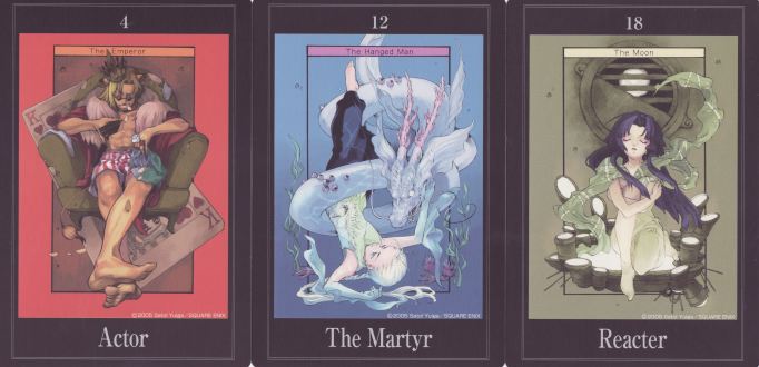 29 September 2009 The rather strangely named E's Tarot from Japan arrived recently. The artwork is by Satol Yuiga one of the Square Enix stable of illustrators and is dated to 2005. This is a majors only deck and each have been renamed but retain their usual titles in the card design. Thus the Fool is the 'Nameless-One', Emperor is 'Actor', the Wheel of Fortune is the 'Royal Maze', Moon is 'Reacter' and so on.