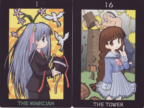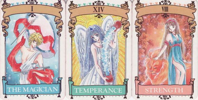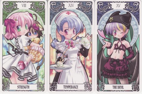 14 August 2009 I have just bought the two Tsundere decks recently issued by the Japanese manga company Dears. "Tsundere" is a Japanese word with perhaps no immediate English equivalent. It has come to describe one of the character types found in manga and anime, being usually applied to a female character who is "in your face" outrageous, displaying much histrionics with a high squeaky voice, and yet with a soft gentle femininity hidden underneath which only appears when needed in the plot. Dears have decided to issue two Tsundere decks - the first has female characters, while the second has male ones. These each come with a CD-Rom which purports to explain the tarot. I suppose we should really see these as promotional items. Unlike many Japanese tarot these are receiving wide distribution and are easily available. ![]()