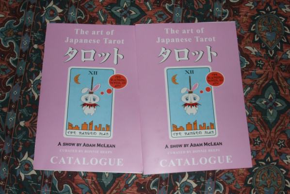 These photographs were kindly supplied to me by Marcus Katz. This is one of the first general tarot exhibitions to be held within an art gallery. There have been many exhibitions of the tarot paintings or prints of an individual artist, but as far as I know almost none presenting the whoile tarot phenomenon as the subject for an exhibition. The exhibition catalogue is now available. You can buy copies here. 7 April 2009 After much work, finally the catalogue for the Art of Japanese Tarot exhibition is finished. I have printed and bound up two proof copies, one for me and the other for the designer and curator, Ronnie Heeps, so we can make sure that no mistakes remain. Once everything is checked yet again, I will begin printing copies which will go on sale at the opening. I will also sell some copies through the Art Tarot website.