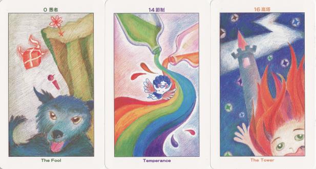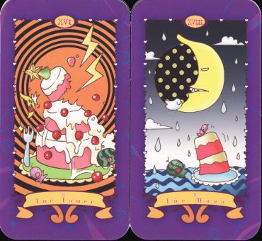 23 January 2009 Comics Fans, is a Hong Kong based magazine aimed at girls, published by Jonesky Publishing Limited. I have acquired a rather nice promo tarot issued in 2008 with Comic Fans. The imagery is rather amusing. I must say I rather enjoyed the Tower as a layered cake and the Moon card is also a bit of a hoot.