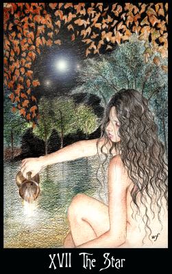 26 June 2009 Today my exhibition on Japanese tarot moves to a new site. A local library in the town of Kilbirnie has recently developed an art gallery space and asked if they could mount my work as its inaugural exhibition. So later today Ronnie Heeps the curator, Pat Smith who made the video and I will travel down to be at the opening. 19 June 2009 I recently received Lo Scarabeo's Tarot of the Dream Enchantress. Who exactly is she? Well Lo Scarabeo don't even seem to know. But she spends a great deal of her time inhabiting the Minors, naked or scantily dressed. In the Majors, with a number of exceptions, she shows her more demure and modest side, even dressing up in order to undertake some alchemical experiments.