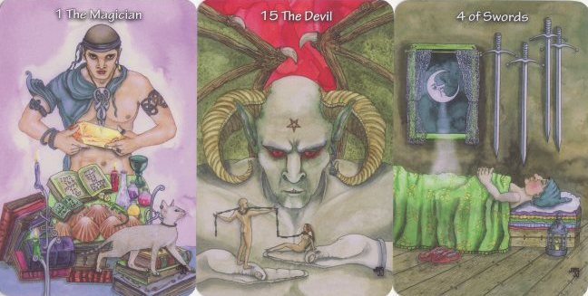 7 April 2010 The Fuller Tarot created by Maggie Fuller arrived a few days ago with a large heavy workbook. The 22 card deck is in black, grey and white. I am a bit perplexed with her choice of imagery for the Devil card, which seems merely to show a village of houses on the side of a hill. The Magician also puzzles me, with the tree-like figure holding a boat above its head, though here we have some of the familiar symbols of the tarot Magician, pentacle, sword, infinity symbol, chalice, etc.