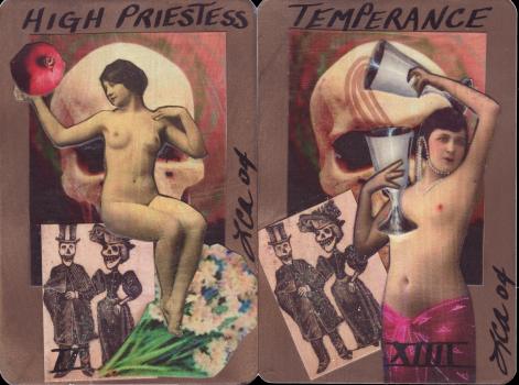 1 January 2009 I don't often buy original tarot works as usually these are well beyond my budget, but occasionally one comes before my view and I am able to buy it. A few days ago I received Laraine Atherton's collage deck in 'day of the dead' style. She produced this hand made collage deck back in 2004. The card background is sprayed with gold paint and each card has the same image of a skull set up on it and an engraved image of two dressed skeletons. This provides a coherent structure on which she collages the various images that relate to the meaning of the particular tarot card. Each card also has a naked or nearly naked pin-up, in classic 1920's style. The thick layers of the collage are then sealed in using pva glue. Many people are rather dismissive of collage, but I found this deck quite delightful and well made.
