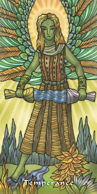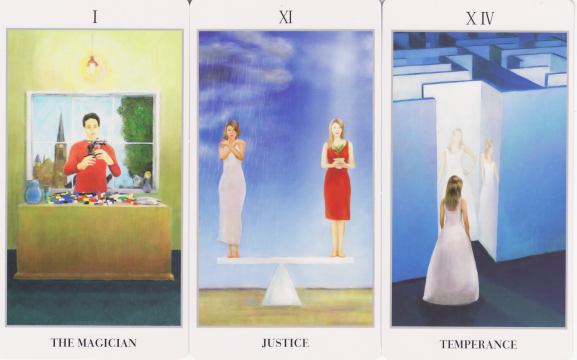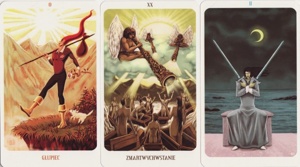 15 June 2009 A week or so back I received a copy of a 78 card Rider Waite clone from Poland with artwork by Robert Lichodziejewski. It is a rather nice production with large cards, is inexpensive and easily available internationally from various Polish online bookshops. It sticks close to the original images with a few quirky additions - I especially liked the aboriginal angels playing didgeridoos on Judgement. The minors mirror the emblematic forms on the Rider Waite.