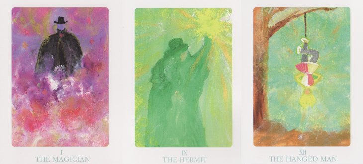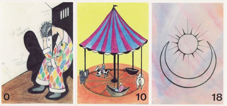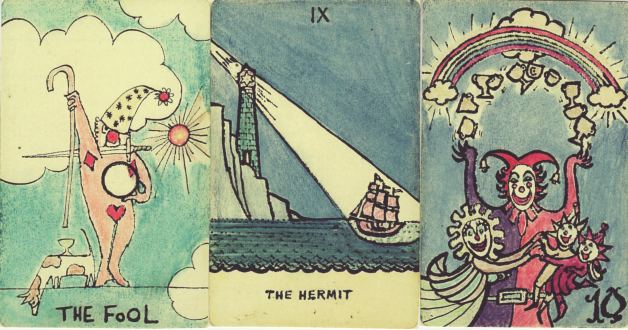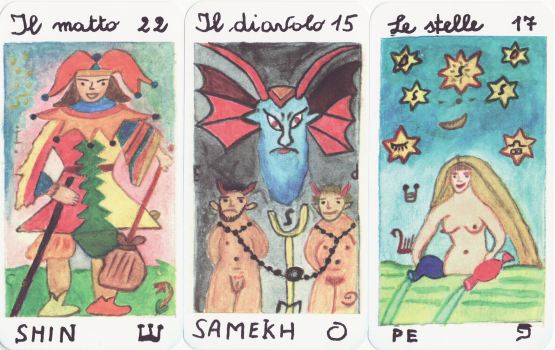 25 February 2009 Today I picked up from the Post Office a packet containing an Italian tarot in a rather naive style of artwork, the Tarocchi Carlotta, issued in an edition of 100 copies. This seems to be based on the Oswald With designs. The 22 Majors have been painted in watercolours by the clairvoyant and tarot reader Carlotta.