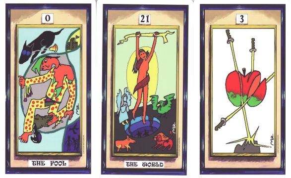 21 June 2010 I may be a fool but I have, however, published twenty three tarot decks over the last four years. Through my work I have enabled the work of these tarot artists to come into a printed form. But it now seems to have been a foolish activity, as completely uncreative people are scanning the decks I have produced and making them available on the internet. Their selfishness destroys the work of artists and publishers. Recent piracy, and the encouragement of others to scan tarot decks at print quality resolution and make them available through the Internet has been the final straw for me and has brought my business to a halt. I will not be able to continue producing tarot decks. I will continue to sell the remaining decks, but it is impossible for me economically to invest my limited capital and time in creating new titles that will be quickly pirated. Sadly, a number of artists will now not see printed editions of their work. I am a fool to have believed that people who care about tarot art would want to support and nourish the work of tarot artists. The foolishness may rebound on the pirates one day when they realise just how destructive they have been. They are responsible for these artists not seeing their work published. Are these artists fools for having wasted many hundreds of hours of their time producing a set of tarot designs never to see them published? The pirates and file sharers are killing tarot. They seem to be selfish self-justifying individuals without conscience. They obviously care nothing for the impact of their activities on the creative work of others. I leave a legacy of tarot publication, brought prematurely to an end by pirates. It could have been so much better. I could have continued for another five years except for these uncreative, parasitic individuals. On a positive note, I am continuing to work on producing the (now) final tarot in my series. I have almost completed the lamination and later this week will begin cutting the sheets into cards and making them up into boxes. Look out for an announcement about publication in a week or so. 18 June 2010 Today I received from Italy the Tarocchi Primitivi Africani. This is the work of the Senegalese artist Moussa Traore. It was created this year from an idea of Emilio Ortun Lieto and published in an edition of only 30 copies by Luca Vietti. The imagery is abstract and symbolic, but it is relatively easy to see the links to the ideas of the Major Arcana. There are so very few tarots with connections to Africa, so this one will have a valued place in my collection.