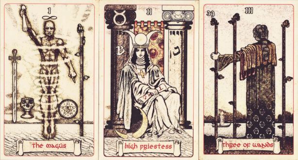 7 June 2009 I have today just completed the production of the Taro of the British occultist and surrealist artist Ithell Colquhoun. This was recently discovered by Richard Shillitoe who worked with me in making these strange abstract designs available in print for the first time. They were exhibited briefly in 1977. She was a painter and writer and along with Eileen Agar and Leonora Carrington, was one of the best-known English women surrealists. A friend of André Breton, she was also associated with Aleister Crowley. Her Taro is an example of a kind of abstract surrealism. She was deeply studied in the Golden Dawn tradition of magic, and wrote a well known book on the subject The Sword of Wisdom, 1975 as well as a strange allegorical novel or gothic fantasy The Goose of Hermogenes, 1971, and other works on Cornwall and Ireland. This is the nineteenth tarot that I have published