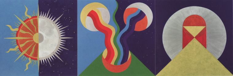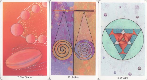5 March 2010 The Tarot of Cosmic Consciousness by Barbara Bruch arrived in a big solid box with a 231 page extensively illustrated book. The imagery for the 78 card deck is abstract, often relying on geometrical forms, and this is explained and amplified in the book. Imagery, allegory and narrative is here dissolved into pure abstraction and archetypal cosmic forms.