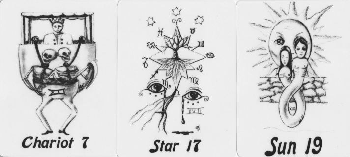28 September 2009 In 2004 the Book of Kaos Tarot was published in Australia. This has a strong foundation in 'magickal' (Crowley-Thelemite-Austin Spare) imagery and uses the powerful pen drawings of the deliciously named Orryelle Defenestrate-Bascule. This was based on the earlier Bohemian Tarot from 1990 when Orryelle was the more prosaically named Geoff Day, though going by the name of Baron Vermin. I have now been able to obtain a copy of the Bohemian Tarot majors which was issued as a signed and numbered edition of 100 copies. It was published in a folder and has a descriptive booklet originally hand-written rather than typeset. The form of publication reminded me of the earlier Thelemic Tarot of Augustus Donelly from 1977. The Bohemian Tarot cards are rather large 8 by 5.5 inches (202 by 140mm) and Day indicates that it is presented as an art piece serving as an exposition of his philosophy. Many of the card images were reused some 14 years later in the Book of Kaos Tarot, but others were changed to reflect the development of Orryelle's ideas and drawing style. He includes an extra five cards. One is called Blood and thus links to the life force and vampirism. Another is The Grove, while there are three cards forming another suit, the Drug Suit, one being named Drunk, a second being Stoned and the third the Trip. The majors are not titled or numbered but here are the Hierophant, Justice and the Hanged Man, each very different from the images used in the Book of Kaos Tarot. ![]() 27 September 2009 A major exhibition of art by women surrealist artists has just opened at Manchester City Art Gallery here in the UK, entitled Angels of Anarchy. Richard Shillitoe who was the major force behind my publishing the Taro by Ithel Colquhoun a few months ago, has loaned one of the packs of the Taro as an exhibit. He tells me it looks most impressive laid out in a display case. 25 September 2009 I have obtained a rather beautiful tarot from Argentina. This is the Tarot Infinito and was issued (possibly as a promotional item) by Canal Infinito, which was a cable television channel in Buenos Aires mostly providing documentaries on subjects of mystery, occultism and on various pseudoscience and mystical subjects. I am not sure if it is still operating. However, they have created a wonderful tarot, printed on large cards in subtle matte tones, overprinted in some small areas with a glossy varnish, which produces a rather fine effect. The artwork is inventive and engaging.