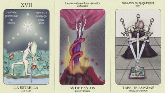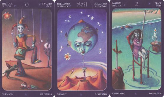 15 February 2010 I like to keep the South American part of my collection as comprehensive as possible, so it was a great delight to be able to buy a copy of the Thayer Tarot from Chile. This was created by the artist Alicia Thayer and comes in a large box with a comprehensive book in Spanish written by Jaime Hales describing each card. These are large round cards in deliciously saturated colour. I paid a high price for this deck as I suspect it will be very difficult to source suppliers in Chile, but as it is a truly delightful work of art, I was happy to pay this.
