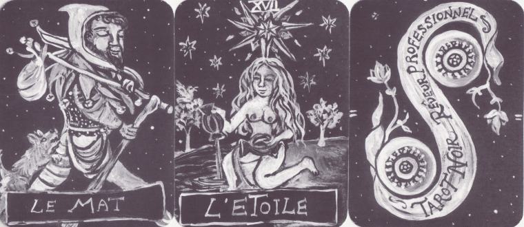 19 February 2010 Today I received a copy of a new self published Italian tarot, I Tarocchi della Notte. This has been created by Maria Carmen Franca. Being a tarot of the night, all the backgrounds to the cards are black. This is a 78 card deck with non-illustrated pips. In addition the pips and court cards each have a border with the various interpretations and correspondences. This is a limited editon of only 50 copies. I was lucky to buy number 1 of the edition.