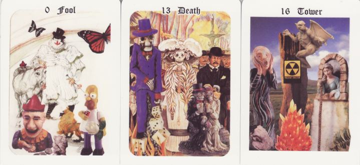 27 April 2010 Marie-Claude Bouthillier, the organiser of the Tarot of Montreal exhibition, has herself produced a fine collage tarot. the Tarot of Lady McBouth. We often find collage decks can be, in some people's hands, merely a haphazard accretion of images, so it is a delight when a trained artist brings her insight and vision into the choice of material used in the compositions and thus creates a coherent set of images. The Chariot, for example, references the well known sculptural piece by Giacometti, which I remember seeing at an exhibition of his work in Edinburgh a decade or more ago.