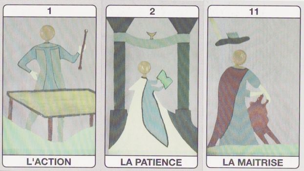 17 March 2009 The rather attractive Tarot de Tours, by the French painter and sculptor, Sylvian Badina, arrived today. It is rather minimalist, reducing the figures to simple forms, while also using a restricted muted palette of greens and browns. The cards are, for the most part, renamed, but the imagery is classic tarot. Needless to say, the artist lives in Tours.