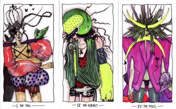 3 June 2010 A week or so ago I received a new tarot by Aya Rosen. Aya is well known for her Black Lily Tarot which she self-published and sold on etsy.com where you can find this and her other artwork on the page louchelab.etsy.com. Aya's work is immediately recognisable by her distinctive drawing style. Her new tarot is the Metro Tarot. It is a set of smallish cards and comes in a soft leather sleeve.