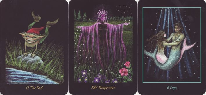 25 November 2009 Taiwan is a source of many interesting and creative tarots. Just issued there by www.Looktarot.com is their Fantasyland Tarot Journal. This is a small format tarot workbook and a set of tarot cards designed by an artist called Mei. The artwork is the much underused coloured pencils which produce those rather delightful textures through the linear strokes. Mei incorporates much animal symbolism into her designs.