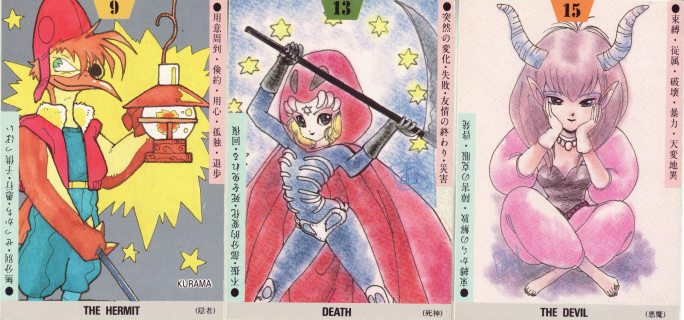 23 September 2009 There are always obscure and almost unknown tarot items to discover. I have just received the Animedia Tarot which seems to have been issued as a gift tarot in a Japanese magazine some 20 or more years ago. The 22 card deck seems to be based on a game and the company may have been an earlier incarnation of the present day large multimedia publishing group e-animedia. The artwork for this earlier tarot is by a number of artists known in the computer game and manga arena, Takayuki Goto, Toyoo Ashida, Mutsumi Inomata and Hatsuki Tsuji. Some of the artwork is quite conventional tarot imagery, but I found Death and the Devil rather cute, and the Hermit seems a bit too charming to be living his life isolated on his own.