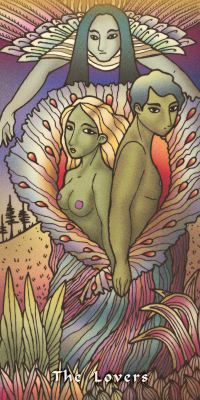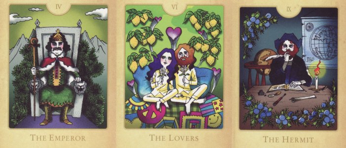 20 April 2010 I recently obtained a Japanese book on astrological aromatherapy by Akiko Toishi. At the back of this paperback book is a set of Tarot images printed on thick card which one can press out and have as a set of cards. Some of the images seem a bit reminiscent of 1960s pop album cover art, such as used on the Beatles Yellow Submarine LP. Here the Lovers is clearly a reference to the famous John Lennon and Yoki Ono Bed-In protest in an Amsterdam hotel. What this has to do with a system of aromatherapy using astrology I do not know, but in a more relevant way each card does bear the image of an aromatic plant.
