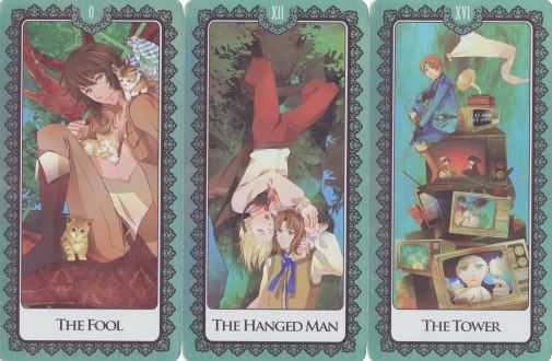 28 February 2009 There are not that many self-published Japanese tarots, but another one fell into my hands recently. This is the Ninja Boy Tarot published in 2008. The imagery is rather cute and keeps close to the established tarot archetypes. Here are the Fool, the Tower and the Sun. I am not sure if it is based on a particular version of the computer game or some manga based on it.