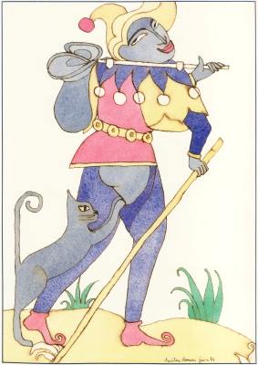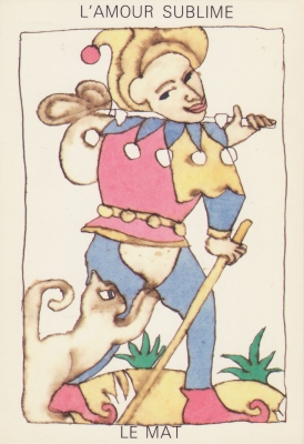 23 December 2008 In my entry in this weblog for 25th May 2007 I showed some illustrations of tarot designs, Le Tarot d'Amour, by Christine Lesueur in a large format book published in 1985. Today I obtained a set of 22 postcards of Le Tarot d'Amour by Christine Lesueur also published 1985. Strangely, though in very similar style, the artwork is different for each format. The images in the book are dated June and July 1984. Here is the image for the Fool, on the left from the book and on the right the postcard version.