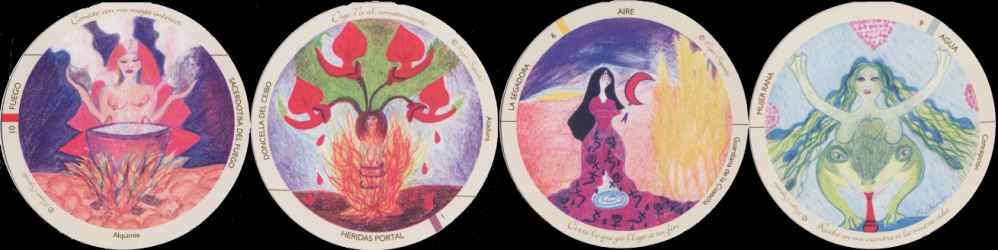 12 March 2010 I seem to have been finding a number of circular tarots recently. The Oraculo de la Mujer Sagrada (Oracle of the Sacred Woman), also titled the Menstrual Tarot, was created by Monica Glusman between 2006-2009. This is not a conventional tarot deck. Although consisting of 78 cards, these are distributed into 6 suits of 13 cards. The suits are Fire, Air, Water, Earth, Wounds-Portal, and the Rainbow. The artwork is in coloured pencil without black outlines, and in the kind of naive style that some people might look down upon. Instead I find such artwork very interesting as the artist's ideas often transcend their ability to realise them on paper and this tension can produce imagery that is very engaging and often powerful - one recalls Cheryl Carlyle's tarot decks. One obvious influence here are the round tarots produced by the US pagan feminists around Shekhinah Mountainwater in the late 1970s and early 1980s - the Shekinah Tarot, Motherpeace, Book of Aradia and Daughters of the Moon tarot decks. Monica Glusman's deck appears to be self-published in Argentina and you can see details of it on her website. I rarely collect oracle decks with no conventional tarot structure, but I decided to make an exception in this case as it is so unusual and creative.