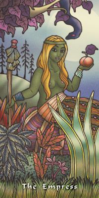 1 December 2009 The Kingdom Within Tarot has been created by Juno Lucina with artwork by Shannon ThornFeather. These appear to be created using a computer painting program. The imagery is eclectic, drawing on all sort of religious and esoteric ideas. The 78 card deck is fully illustrated and though the imagery on the pips does draw on Pamela Colman Smith's ideas, in many cases it departs from these and adopt different imagery. The Empress is classic in its simple image, the phallic Tower is struck by a flaming earth or planetary globe, while the Seven of Cups has a seven towered sand castle. The artwork is quite creative in places but the rather limited modelling of the human forms will perhaps not suit everyone.