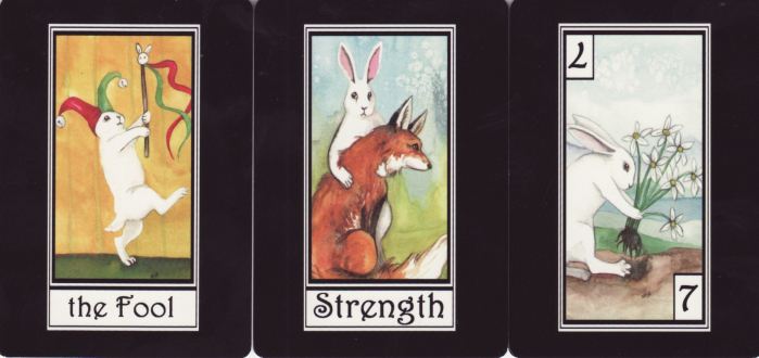 15 October 2009 I am now working on laminating the next tarot in my Art Tarot series. Hopefully, I should be able to complete work on it by the middle of next week. This is one of the wonderful designs of Philippine artist Lynyrd Narciso. It bears the title in old Filipino Tarot ng Daigdig sa Balintataw which translates to "The World inside the Pupil" (the black part of the eye). Of course, the artwork is wonderful with subtle muted colours keyed to a tight palette. Check my tarot website later next week to see some sample cards. Hopefully, some people will want to buy copies. 12 October 2009 I have now receive the quite delightful Rabbit Tarot by Nakish Vanderhoeven. I bought the deluxe version which is a 78 card deck of small cards that comes with a mass of extras, a large format book, a set of postcards with designs from the deck, an ACEO card and other items. The rabbit images are really well drawn and delightfully envisaged as to rival the cuteness of many cat tarots. The pips are emblematic but quite simple in form. The suits are renamed so as to be meaningful for rabbits, to Carrots, Daisies, Sticks and Tulips. ![]() ![]() 9 October 2009 A week or so ago I managed to buy a copy of a rather rare and consequently expensive Japanese Tarot. This is the Hindu Tarot by Kali published in Japan in 1986. It comes in a solid box with an illustrated book. At first sight it does not seem to have a tarot structure, as there are 51 cards, however 16 of the cards bear the standard titles to the majors while the others have a Hindu name (such as Vishnu or Brahma) or some philosophical concept (such as emotional, the past, interchange) or some other term. A table in the book shows the associations of the cards to the tarot majors. The first five cards relate to arcana 1 to 5 (Magician to Pope), the next ten cards relate two at a time to the next five arcana, while the remaining 36 relate three at a time to the remaining 12 arcana. It is a collage deck, made with scissors, paste and cut out images. The title page bears the mantra "Hari Vishnu, Hari Krishna" so I wonder if it perhaps emanated from some Japanese followers of the ISKCON movement which was still very popular and visible on the streets of most cities in the 1980s.